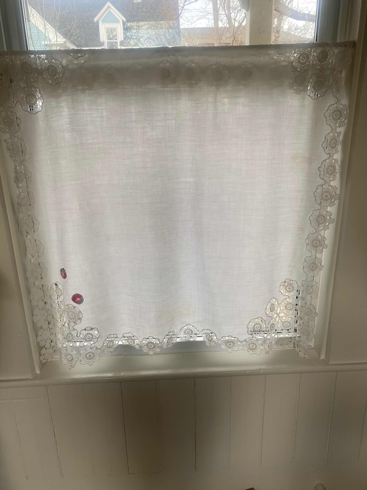 In honour of international mend in public day I have fixed this beautiful lace edged tablecloth to use as a curtain in our kitchen. I haven’t completely fixed it but I’ve repaired the largest rents.