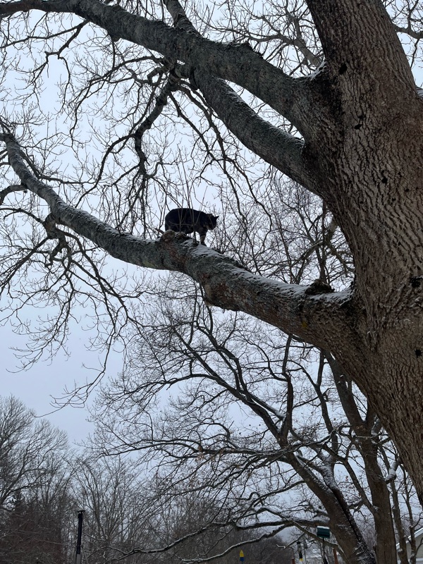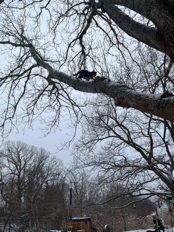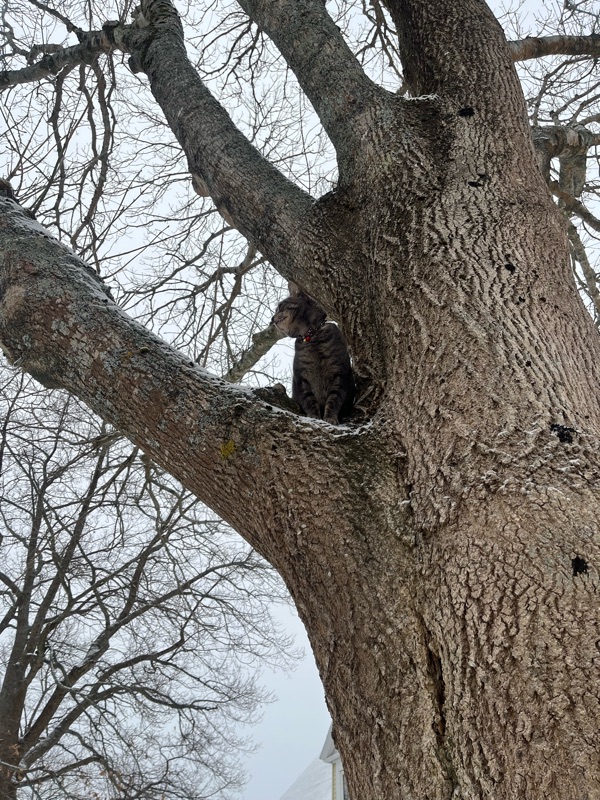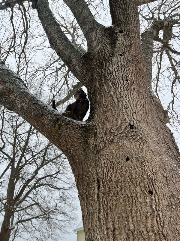 It’s a tall tree! His cat is at least at the second story. He jumps from about 10 feet up to the ground.